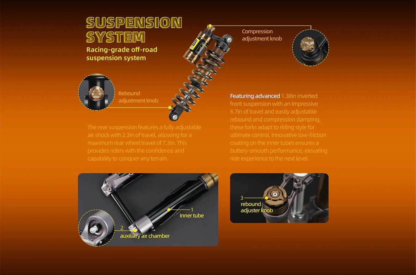 35mm inverted dual shoulder – oil spring type – adjustable rebound damping – adjustable compression damping pressure – total length 625mm, stroke 170mm